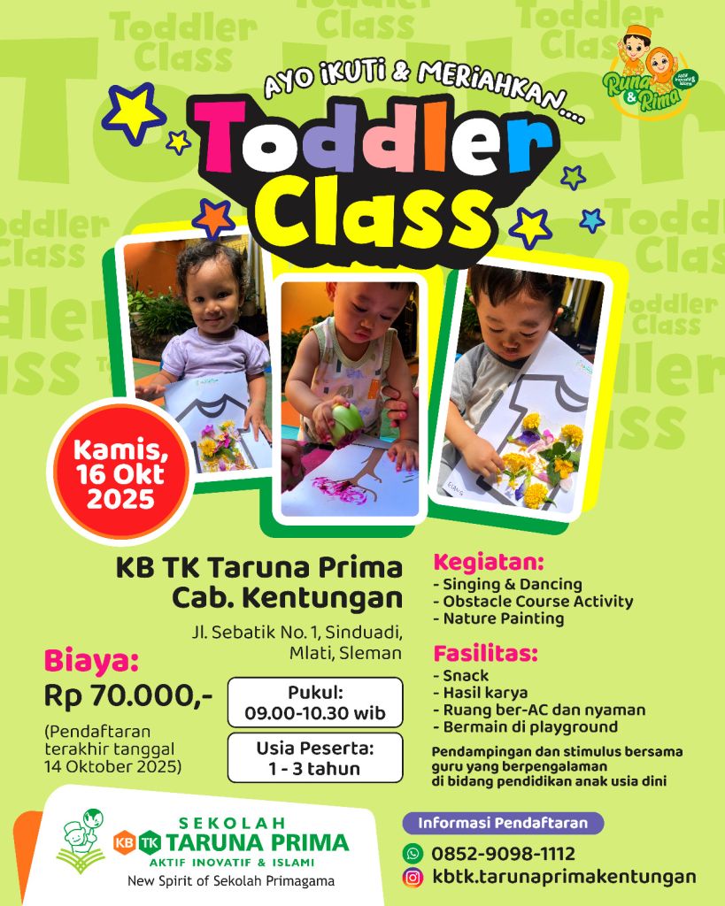 Salah satu cara terbaik untuk memperkenalkan dunia belajar sejak dini adalah melalui Baby & Toddler Class. Di KB TK Taruna Prima, kegiatan ini bukan sekadar bermain, tetapi sebuah pengalaman penuh cinta yang menumbuhkan rasa ingin tahu dan kepercayaan diri anak sejak dini.