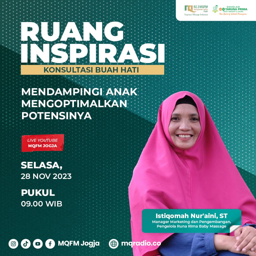 Simak Ruang Inspirasi Konsultasi Buah Hati bersama @kbtk.tarunaprima yang akan membahas tentang “Mendampingi Anak Mengoptimalkan Potensinya” kita akan berbincang bersama Istiqomah Nur’aini, ST (Manager Marketing dan Pengembangan, Pengelola Runa Rima Baby Massage) Selasa, 28 November 2023 , pukul 09.00-10.00 WIB di Radio Keluarga MQFM Jogja (ON AIR)