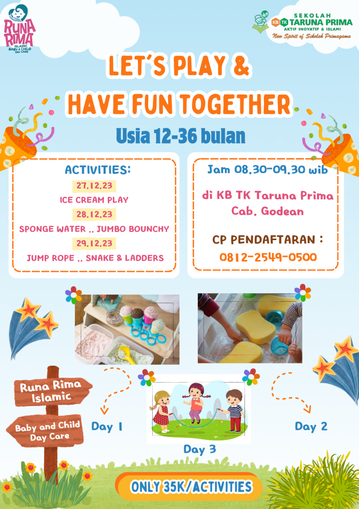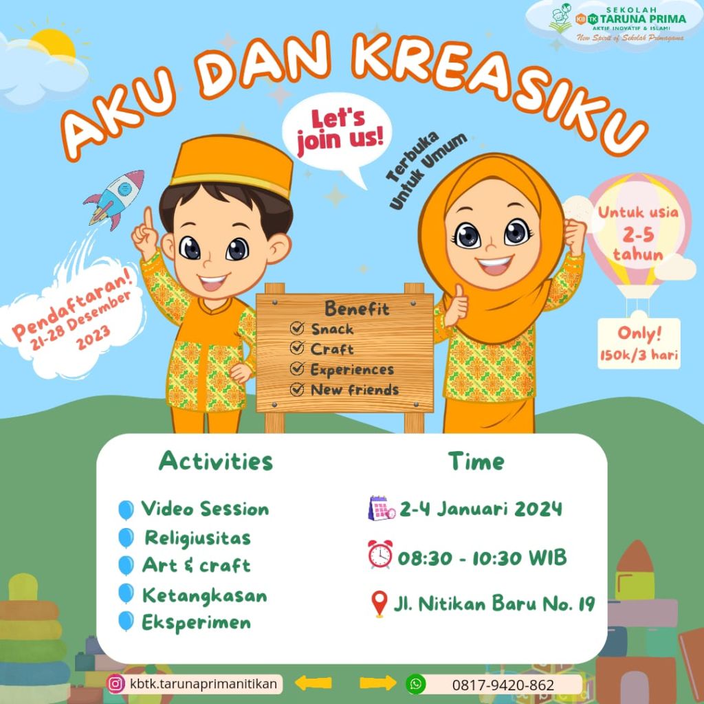 Hai…Sahabat Runa & Rima Ingin punya kegiatan seru yang menyenangkan …? Ikuti …Aku & Kreasiku Bersama KB TK TARUNA PRIMA NITIKAN Catat tanggalnya ya… 📅 2 – 4 Januari 2024 🕣 dari jam 08.00 -10.30 WIB 🏡 tempat di KB TK TARUNA PRIMA JL. Nitikan Baru no 19 👩 usia 2 – 5 tahun (peserta …