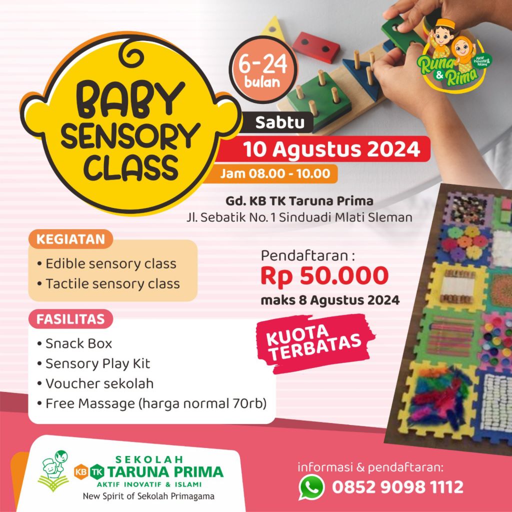 Assalamualaikum Wr. Wb. AyBun yuk ikuti kegiatan Baby Sensory Class bersama KB TK Taruna Prima cabang Kentungan Rangkaian Kegiatan📆 Sabtu, 10 Agustus 2024🕗 08.00-10.00👶🏻 Usia 6 bulan-2 tahun🏫 Sekolah KB TK Taruna Prima Jl. Sebatik No.1 Sinduadi Mlati Sleman Kegiatan:Mengenal aktivitas edible sensory dan tactile sensory 🎁Fasilitas:-Snack box-Sensory play kit-Voucher sekolah-Free massage (harga normal …